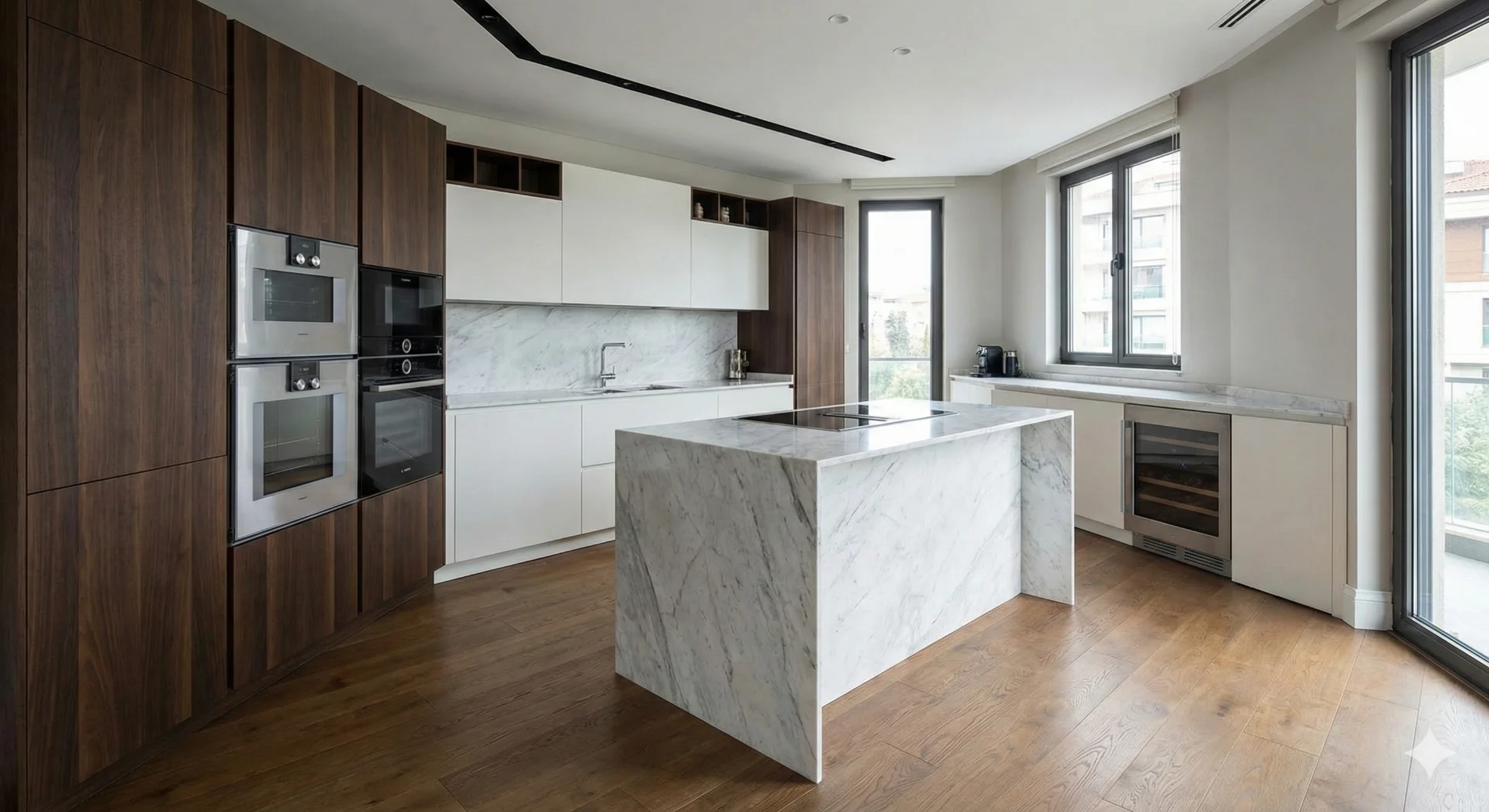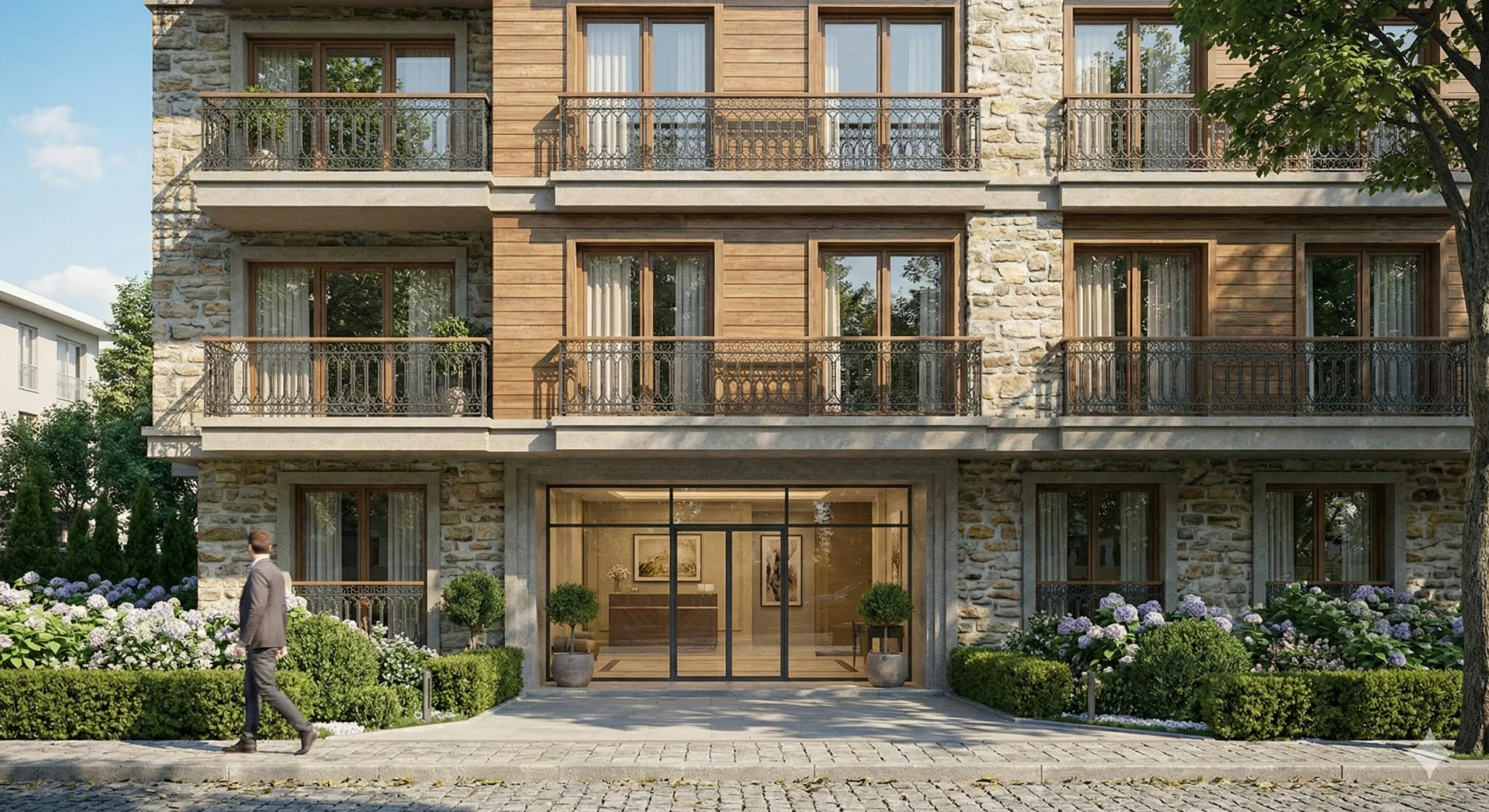 Proje, devasa rezidansların aksine, sadece 12 seçkin ailenin bir arada yaşayacağı, sıcak ve samimi bir "apartman" konseptiyle tasarlandı. Dış cephede kullanılan doğal taş, ahşap paneller ve özel tasarım ferforje balkon korkulukları, binaya zamansız bir klasik hava katarken, geniş cam yüzeyler iç mekanların maksimum gün ışığı almasını sağlıyor.